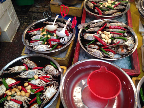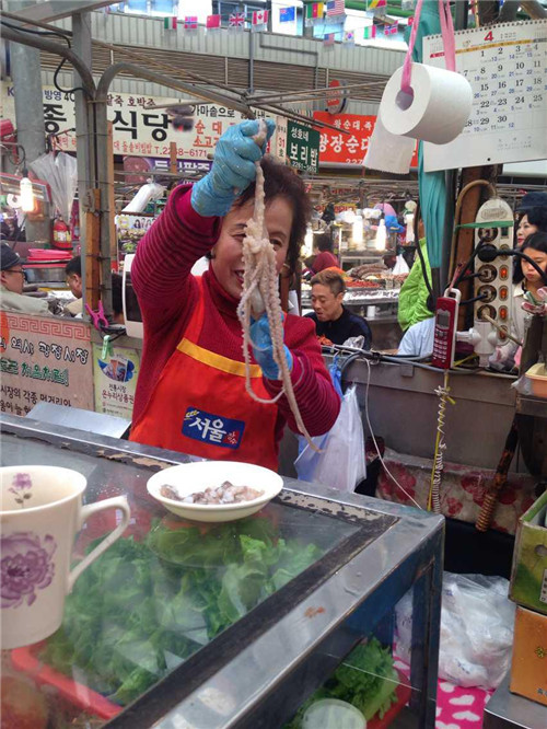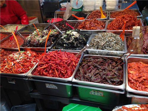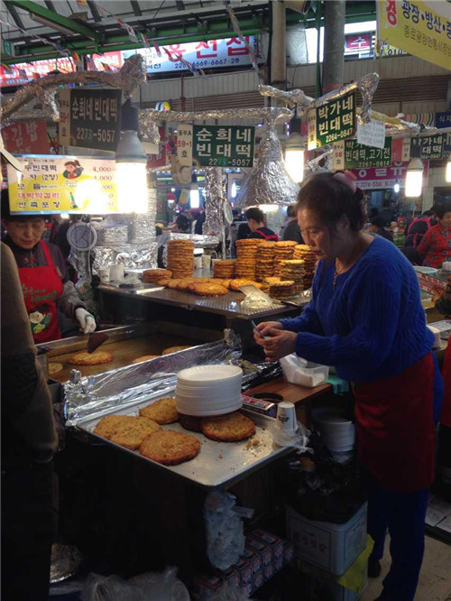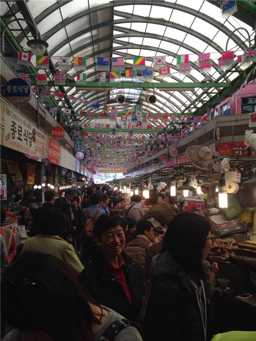 隨后在導(dǎo)游的帶領(lǐng)下前往廣藏市場(chǎng)。首爾的廣藏市場(chǎng),是韓國(guó)國(guó)內(nèi)規(guī)模最大的市場(chǎng)了,作為市場(chǎng)控,這里又是一個(gè)必到之處。廣藏市場(chǎng)的歷史可以追溯到1904年,這里就像是我們國(guó)內(nèi)的自由市場(chǎng)一樣,賣的東西五花八門,從服裝鞋帽到日用百貨應(yīng)有盡有,而最熱鬧的要數(shù)小吃攤,現(xiàn)做現(xiàn)賣的風(fēng)味小吃最受食客們的歡迎,據(jù)說(shuō)到了深夜也摩肩接踵,絡(luò)繹不絕呢!深受國(guó)內(nèi)熱播真人秀節(jié)目“奔跑吧兄弟”影響,同事們走走停停,嘗了各種地道美食,解決了我們的晚飯。