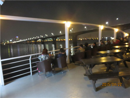 晚上8點(diǎn),我們登上《星你》劇中女星盧素英舉行婚禮的豪華游輪,也就是都敏俊第一次不小心KISS了千頌伊的地方。首先,我們進(jìn)行了一場(chǎng)面包制作DIY體驗(yàn)。一團(tuán)面球在同事們的巧手下包上紅豆餡押上各種造型送進(jìn)烤箱等待約30分鐘的烘烤。出爐前的時(shí)間導(dǎo)游帶領(lǐng)大家搭乘游覽船游漢江。