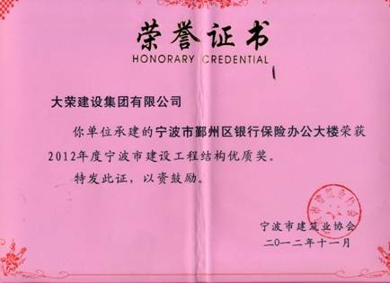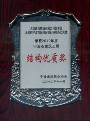 | 我公司承建的寧波市鄞州區(qū)銀行保險辦公大樓工程榮獲“2012年度寧波市建筑工程結(jié)構(gòu)優(yōu)質(zhì)獎”。 | |