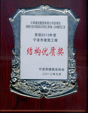 寧波市濱海國際合作學校二期中軸、九年制教學區(qū)工程是繼去年寧波市鄞州區(qū)銀行保險辦公大樓工程后我公司獲得的第二個“寧波市結(jié)構(gòu)優(yōu)質(zhì)獎”工程。 “寧波市建筑結(jié)構(gòu)優(yōu)質(zhì)獎”是寧波市建筑工程結(jié)構(gòu)質(zhì)量的最高榮譽獎,也是參評“寧波市甬江建設(shè)杯”錢江杯“的先決條件。此次的獲獎,也為該工程申報2013年寧波市甬江建設(shè)杯奠定了基礎(chǔ),更為來年申報“錢江杯”開了個好頭! 下圖為結(jié)構(gòu)優(yōu)質(zhì)獎獲獎證書。